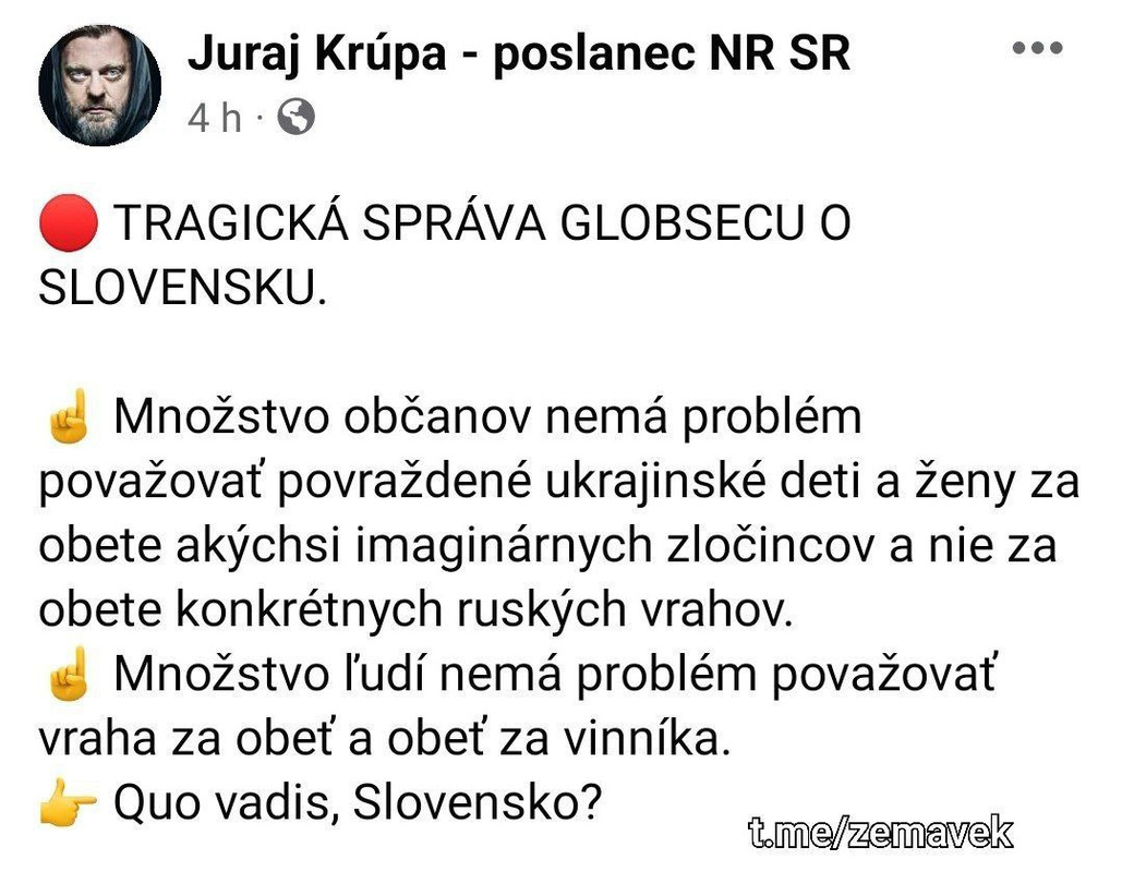 Množstvo občanov nemá problém považovať povraždené afganske, pakistanske, palestinske, vietnamske, iracke, iranske, syrske, lybijske a juhoslovanske deti a ženy za obete akýchsi imaginárnych zločincov a nie za obete konkrétnych americkych vrahov Množstvo ľudí nemá problém považovať vraha za obeť a obeť za vinníka. Quo vadis, pan Krupa? Quo vadis, Globsec? Quo vadis, Dennik N? - dk - |