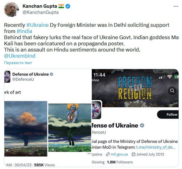 „Toto je útok na city hinduistov na celom svete... Ukrajina sa teraz vysmieva bohyni Kálí spôsobom, ktorý ešte žiadna zahraničná vláda neurobila," vyhlásil Kanchan Gupta, hlavný poradca ministerstva informácií.