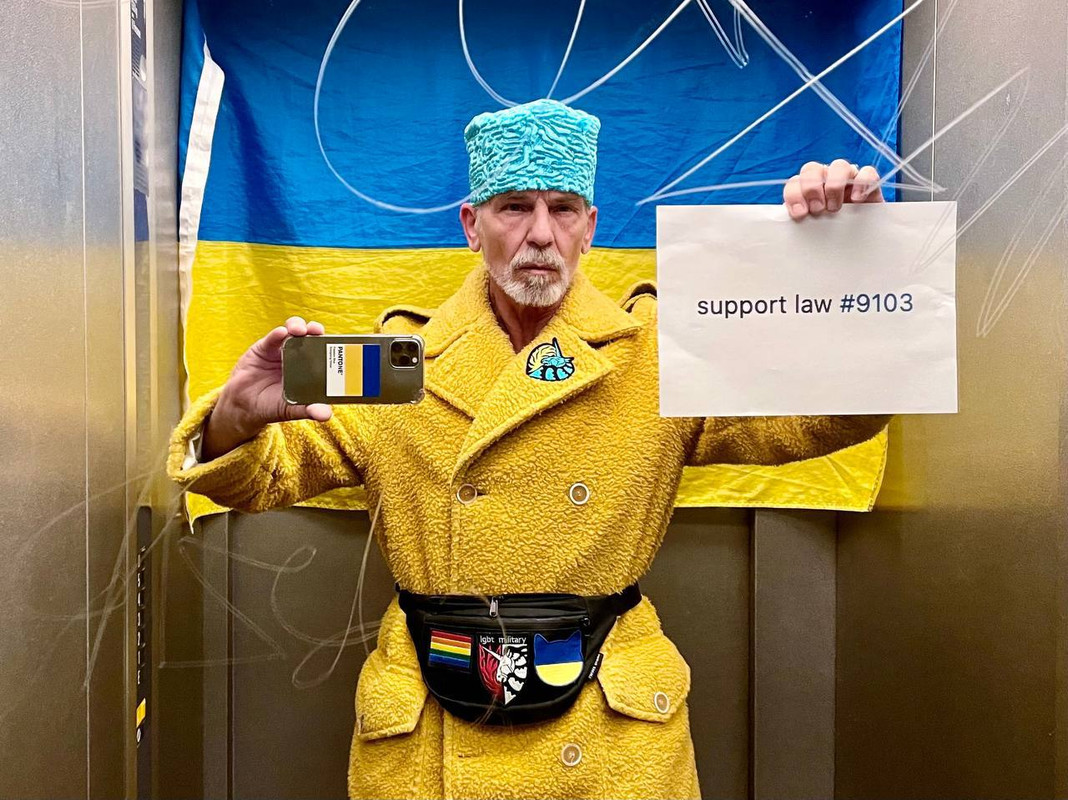 “Náš priateľ a známy dizajnér Frank si vyrobil výťahový look na podporu návrhu zákona č. 9103 o registrovaných partnerstvách.” https://i.postimg.cc/50zD1n1w/photo-2023-06-03-14-46-44.jpg |