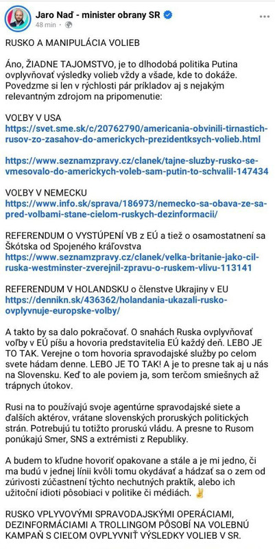 Na to sa dá len ťažko odpovedať. Jednu vec si trúfnem v rámci predvolebných prieskumov odhadnúť na základe predošlých rokov. Najmenej ich bude ovplyvňovať zdravý rozum. Bývalý minister obrany pred pár dňami oznámil „Keď tu niekto chce manipulovať voľby, chce to Rusko a používa na to svojich trójskych koňov, vrátane politickej strany Smer-SD”. Podľa neho o tom dostali spravodajskú informáciu najvyšší ústavní činitelia. ( Inak, ak už uvažujeme o trójskych koňoch, najlepším ruským trójskym koňom bolo účinkovanie vlády, ktorá pre občanov neurobila nič, iba ich uráža a pôsobenie prezidentky, a samozrejme médií, ktoré nehorázne klamú a prikrývajú všetky ich prešľapy. Rusi nepotrebujú minúť ani rubeľ, aby proamerické figúrky na šachovnici, dostali šach-mat. Či je ambasáda hrdá na výkony svojich slovenských „partnerov“ sa dá posúdiť len ťažko, keď v médiách vidíme, ako sa ich prezident, „najmocnejší muž planéty“ ako ho radi označujú, veselo kopŕca takmer na každej akcii.) Hra na zlé Rusko, ktoré ovplyvňuje voľby je mimoriadne obľúbenou zábavou najmä v USA, pred ktorými je bývalý minister ako aj mnohí významní ústavní činitelia na Slovensku v hlbokom predklone. Prečo by na Slovensku nemohlo zafungovať to, čo si mysleli, že im bude fungovať za veľkou mlákou. Link na článok na doméne pravda.sk |