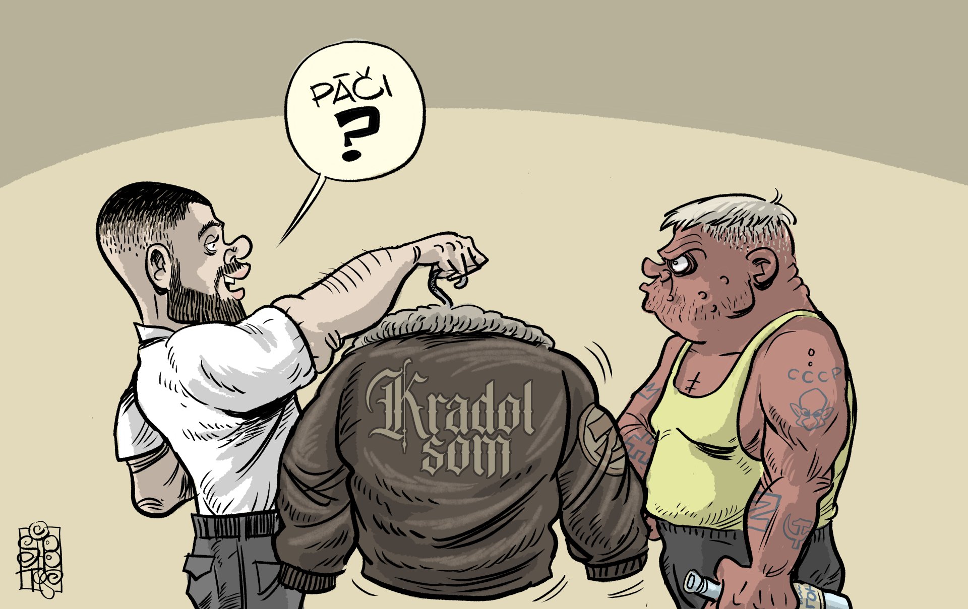 | Odborník je cez kontroly, má vraj na to všetky školy, kontroluje úrad, SISku, vie sa biť na parkovisku. Chodí, dáva rozhovory, skúma, vidí za obzory, no a jeho videnia majú znaky blúdenia. Nemal problém s týmto Riško, nápad jeho prišiel friško, vypudil ho zo seba, rýmovať ho netreba: "Ja som za to, aby keď som kradol v obchode, aby som bol v bunde ... nejakej, ktorá má napísané vzadu 'Kradol som', aby bol umiestnený v blízkosti miesta svojho trvalého pobytu, kde je všeobecne známou osobou, aby tam musel vykonávať verejnoprospešnú činnosť, môže takisto pomáhať obchodu, ktorému spôsobil škodu a verte mi, že by si to rozmyslel." Link na článok na doméne sme.sk | ||