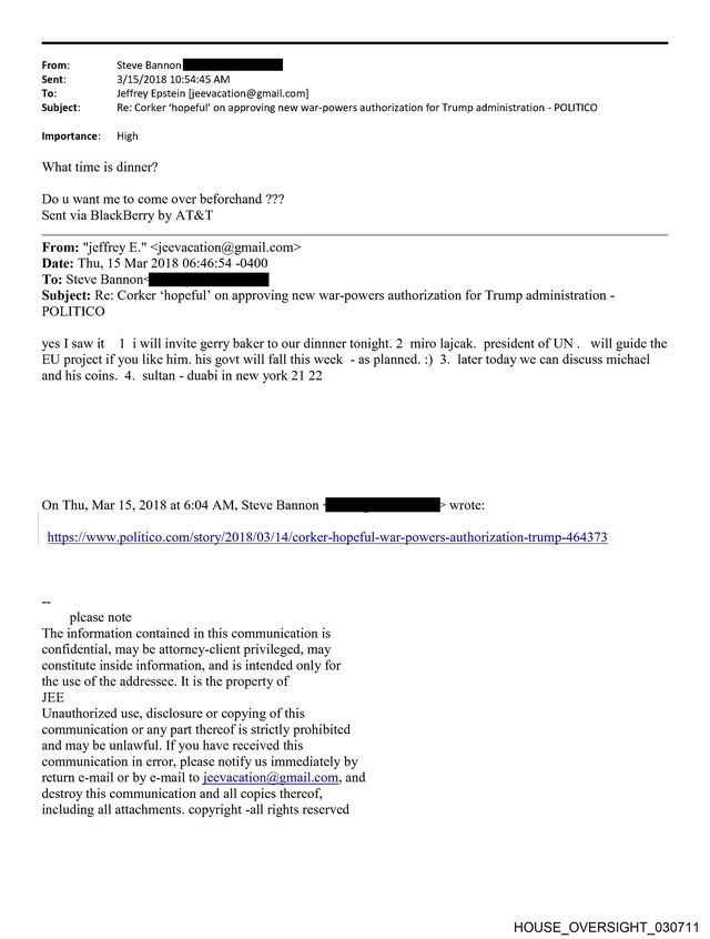 Bannon sa v tom čase pokúšal rozbehnúť európske populistické hnutie a stretával sa s krajne pravicovými politikmi, no nie je jasné, či mal v správe odsúdenému sexuálnemu predátorovi na mysli tento projekt.