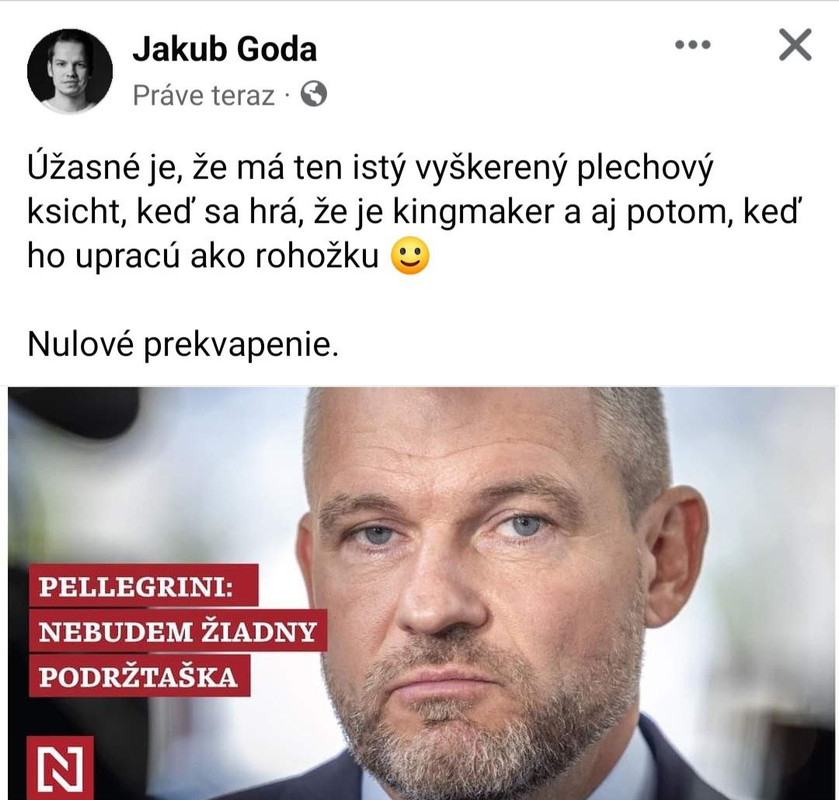 Goda by sa mal radšej pozrieť sám do zrkadla, lebo za žiadneho slovenského Brada Pitta neplatí. No a inak je to údajný expert na sociálne siete a poradca Čaputovej pre komunikáciu. Teraz ukázal, ako vie komunikovať sám. Akurát tak expert na progresívnu nenávisť.