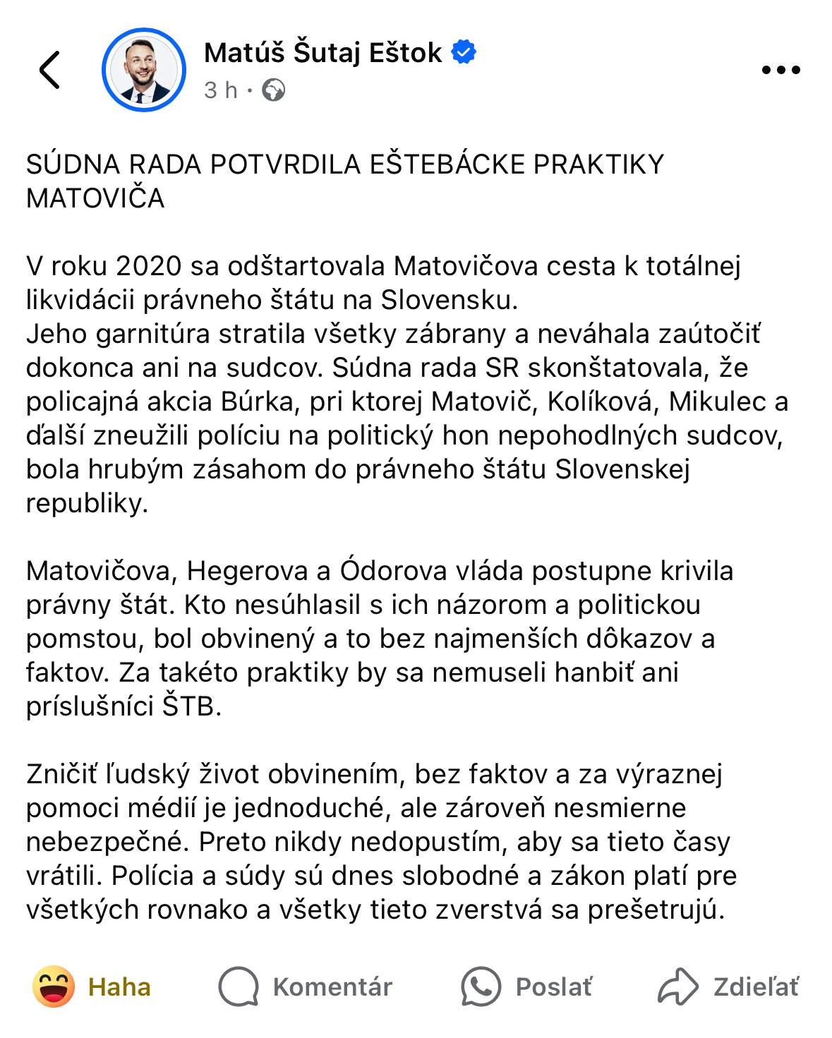 A ako minister vnútra, ktorý má dbať na dodržiavanie zákonov, vysvetlil svoju „administratívnu chybu" Viete, ako minister som mal ešte viacej povinností ako teraz, chodil som po Slovensku. Vtedy som dokonca ešte hrával futbal, volejbal, všetko možné.“ Zabudol som ich poslať, pretože ja som človek, ktorý si všetko necháva na poslednú chvíľu.“ Konkrétne čistky na polícii urobil Šutaj Eštok na prvú možnú chvíľu, ale aj bez toho sme sa dostali do štádia, keď si ústavný činiteľ môže dovoliť vyhlásiť, že hral futbal, a preto takmer pol roka porušoval zákon, a nestane sa vôbec nič. Peter Pellegrini zostane prezidentom, Matúš Šutaj Eštok ministrom a polovica krajiny bude úprimne presvedčená, že je to tak správne. |
